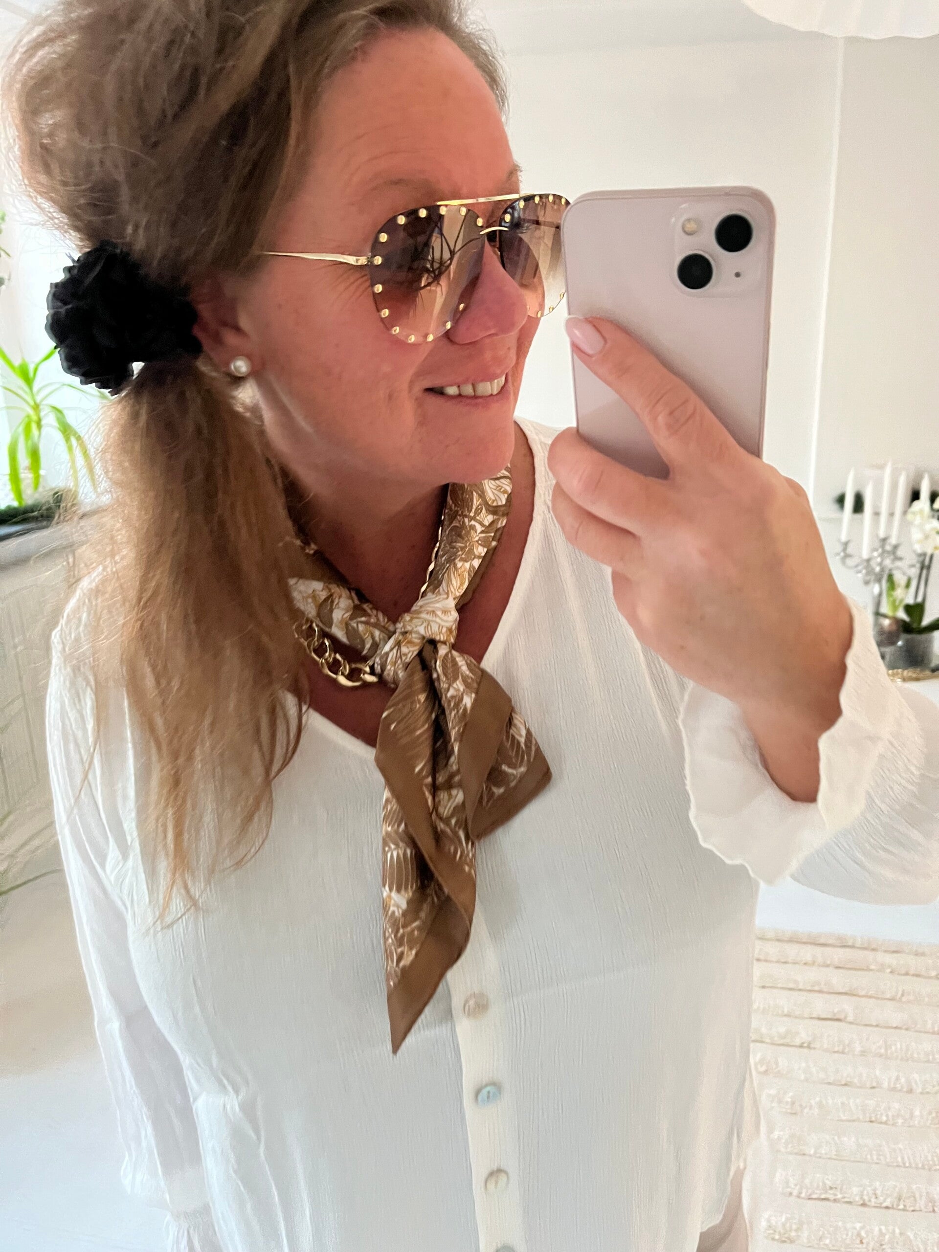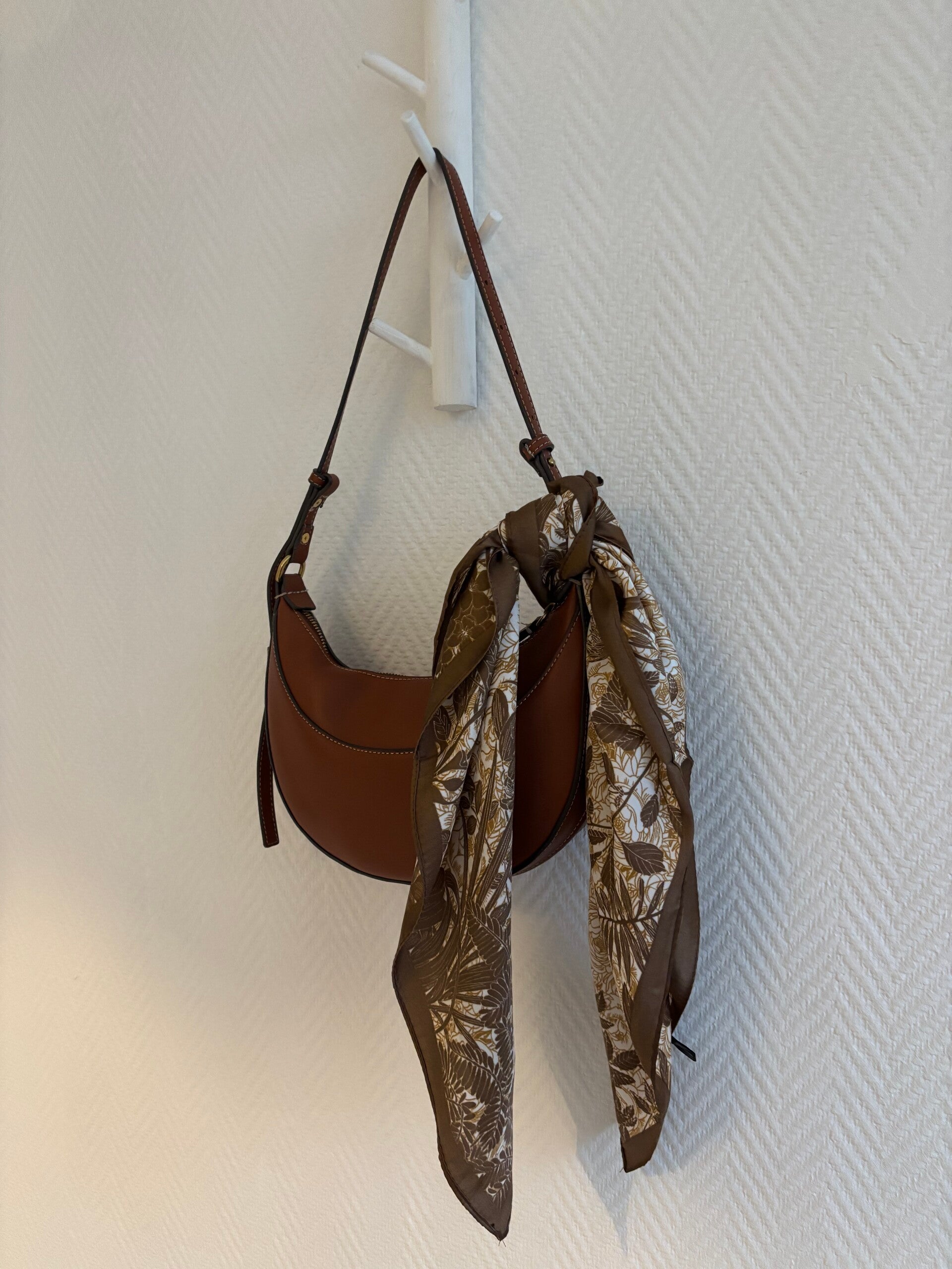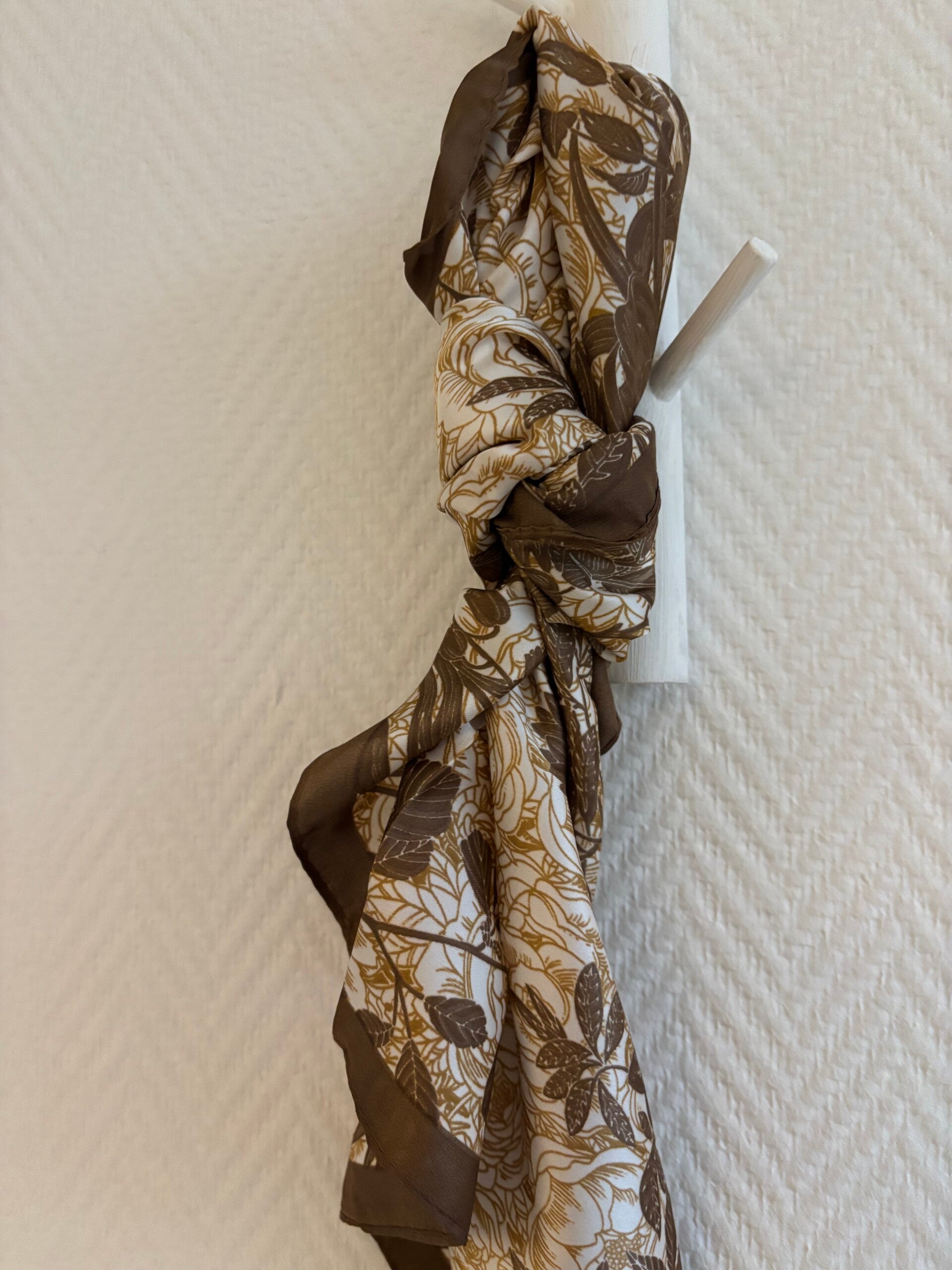 Liten sjal i beige och bruna färger som går att knyta runt halsen, likaså runt en väska eller liknande för att piffa upp.