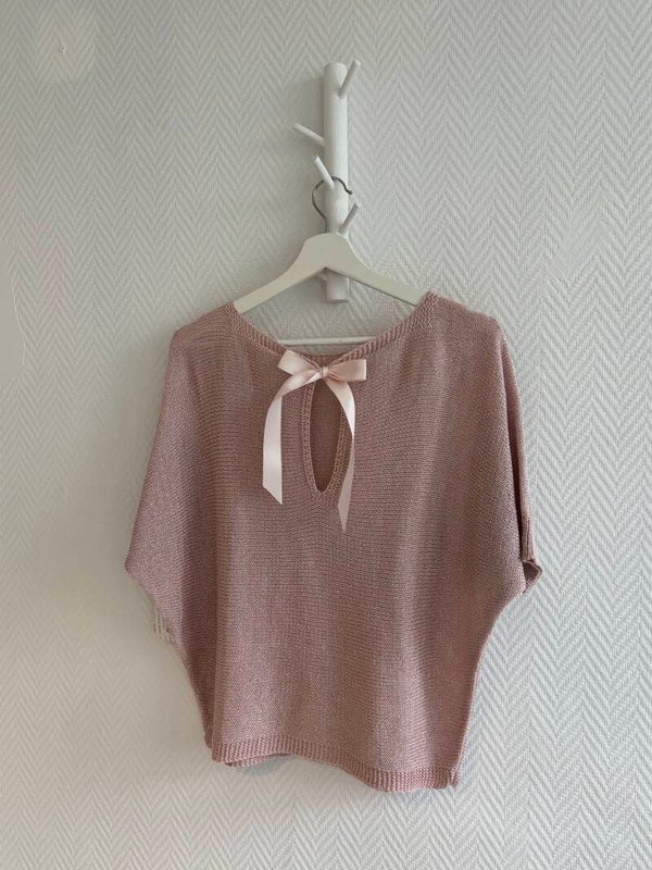 Mjuk glittrig rosa stickad tröja med en rosett i nacken, korta ärmar, sticks inte.