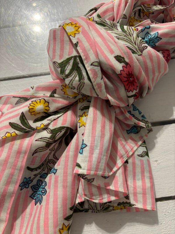 Rosa randig sjal med blommor på sig, passar perfekt till våren.