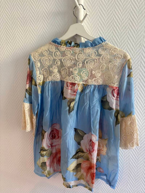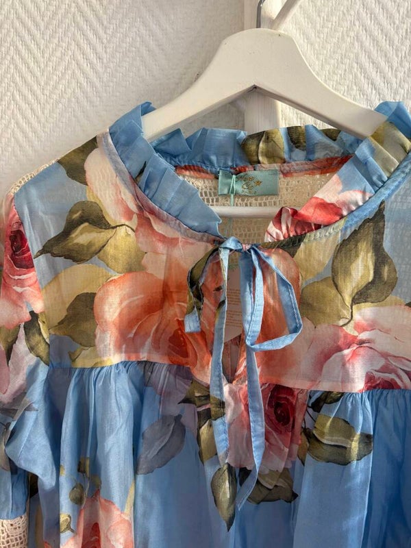 Blå blommig blus med broderi
