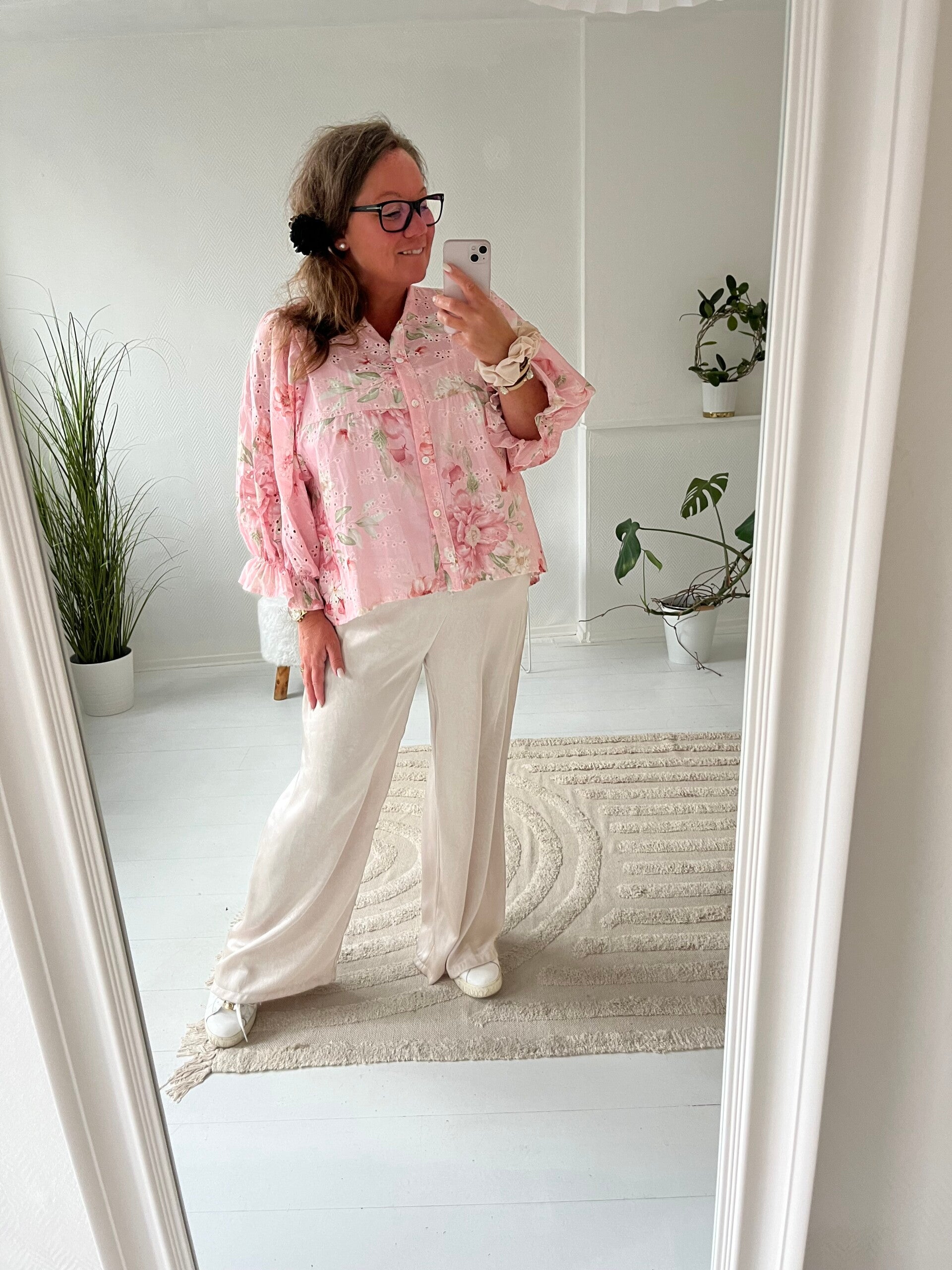 Rosa blommig blus med små dekorativa hål i. Knappar längst hela, längre ärmar. Passar perfekt till vårens alla tillställningar eller bara för att piffa till vardagen lite.