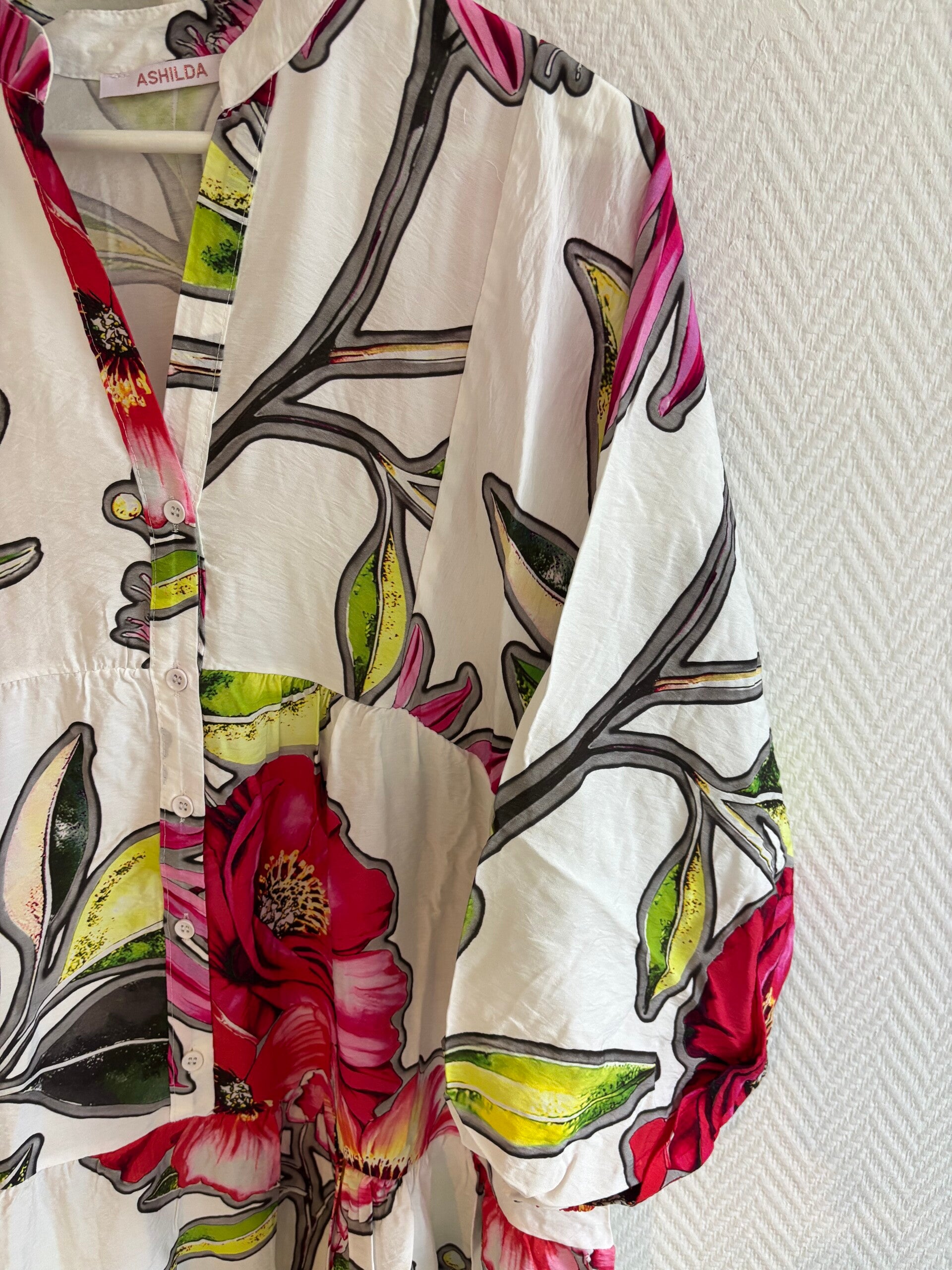 Den perfekta långklänningen till sommaren med volnager och halvlång lösare ärm. Klänninge har en vit botten med stora röda blommor på och gröna stora blad. Klänningen har en v-ringning med knappar som går en bit ner.