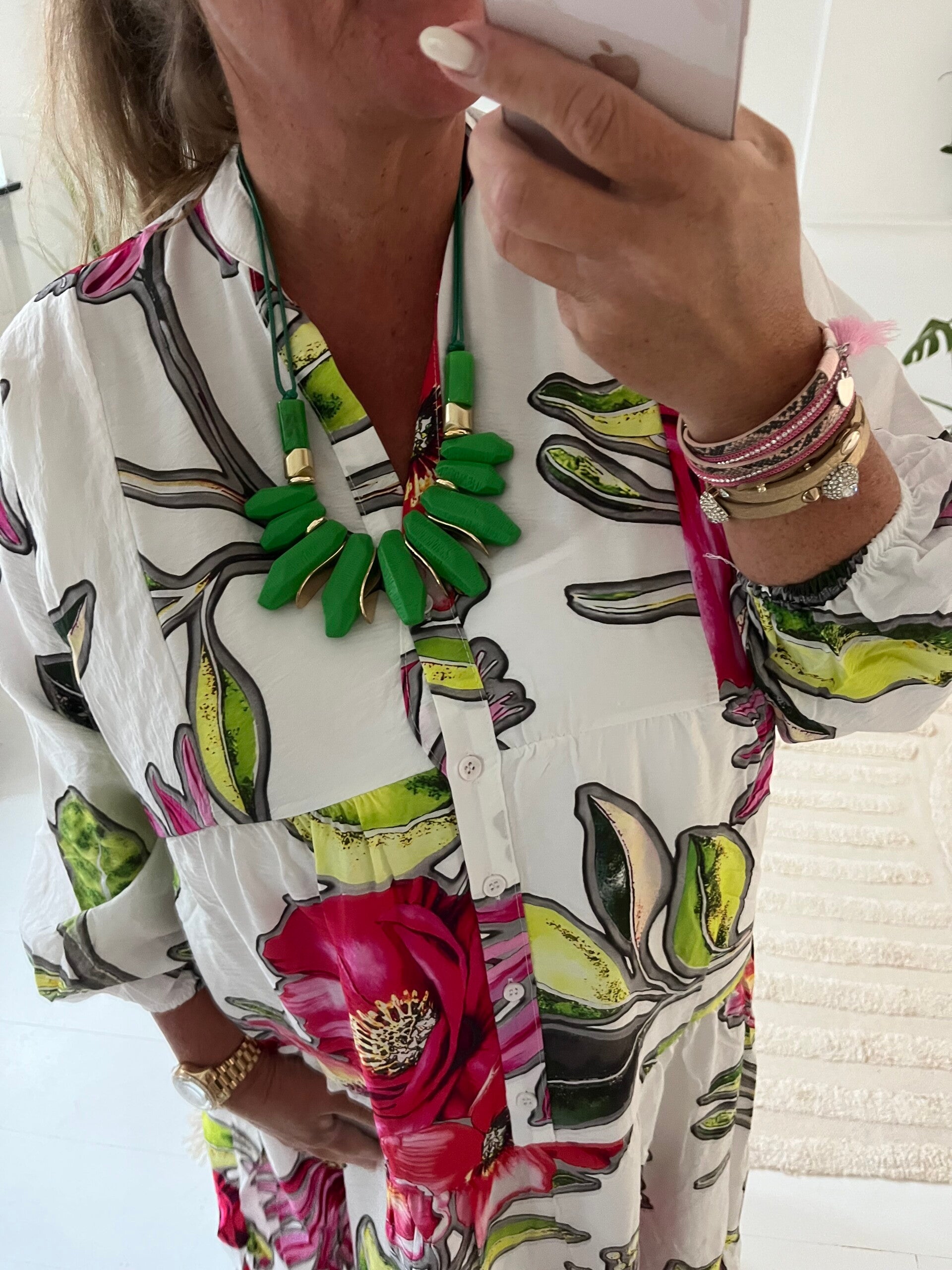 Den perfekta långklänningen till sommaren med volnager och halvlång lösare ärm. Klänninge har en vit botten med stora ljuvliga blommor på och gröna stora blad. Klänningen har en v-ringning med knappar som går en bit ner. En riktig vår/sommardröm