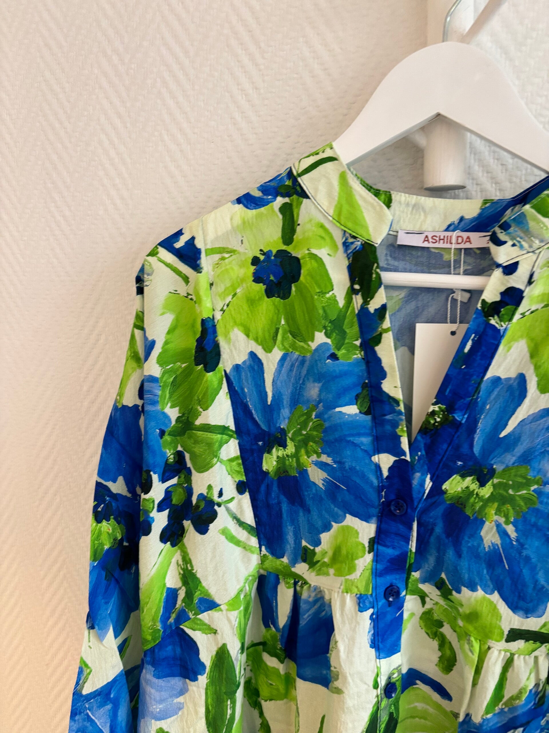 Med denna underbara klänning syns du på långa håll, en underbar klänning i färgerna grön och blå, med långa ärmar och resor i ärmens slut. V-ringning och knappar nedtill.