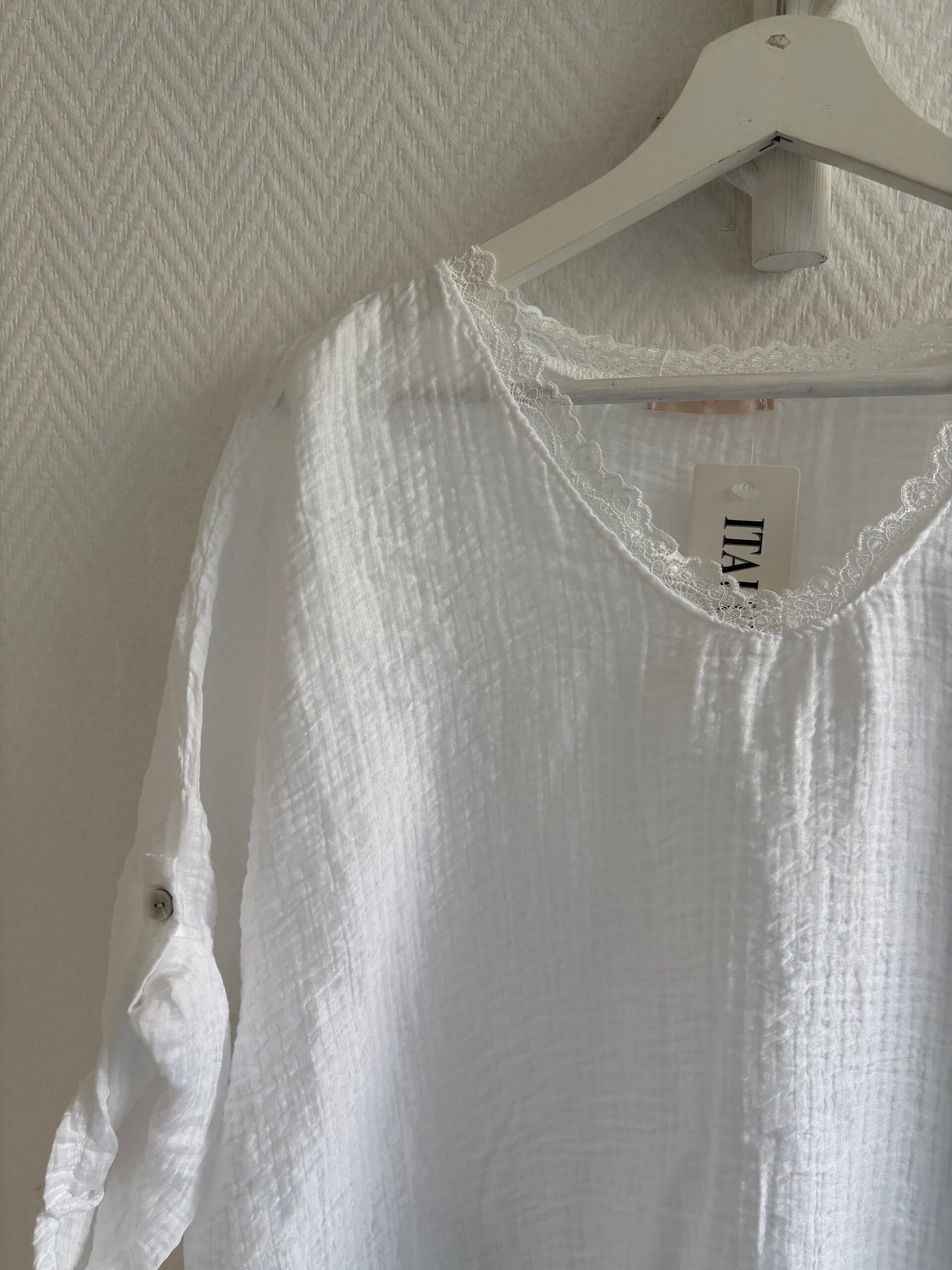 En underbar blus med kortare uppvikta ärmar med knapp. Blusen har även en så fin spetskant nedtill och även en liten vid halsen. Blusen är något längre baktill och passar perfekt till vårens alla tillställningar och dagar. Matcha med våra magsika brallor, en kjol eller varför inte ett par jeans?