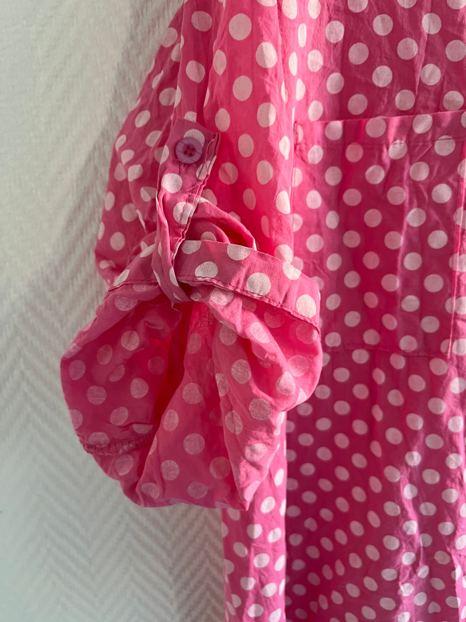 En luftig favorit för varje säsong – vår prickiga långskjorta i mjuk bomull kombinerar tidlös elegans med avslappnad komfort. Det lätta, andningsbara tyget känns behagligt mot huden och gör plagget perfekt både för varma dagar och som ett lager över svalare Bär den öppen över ett linne och jeans för en avslappnad look, eller knäpp den hela vägen för en mer dressad känsla.