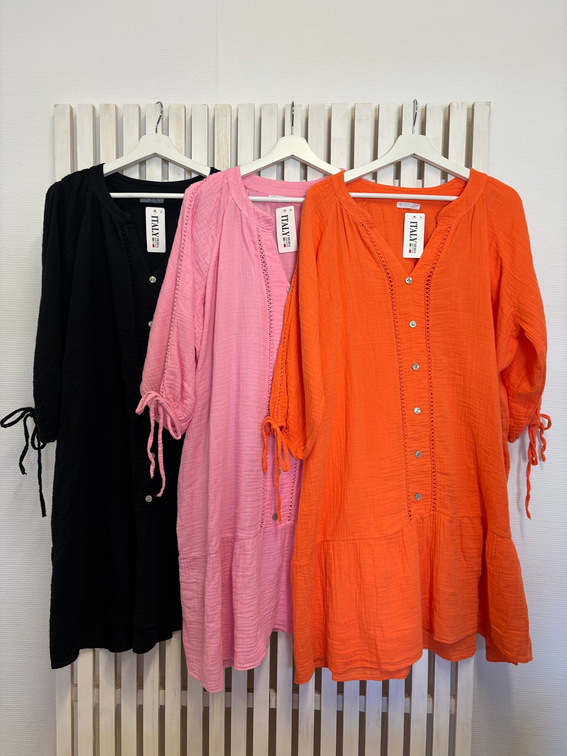 Hur underbar bomullsklänning att bära, kommer i tre olika färger. Något kortare ärm med knyte. Så snygg v-ringning och knappar.