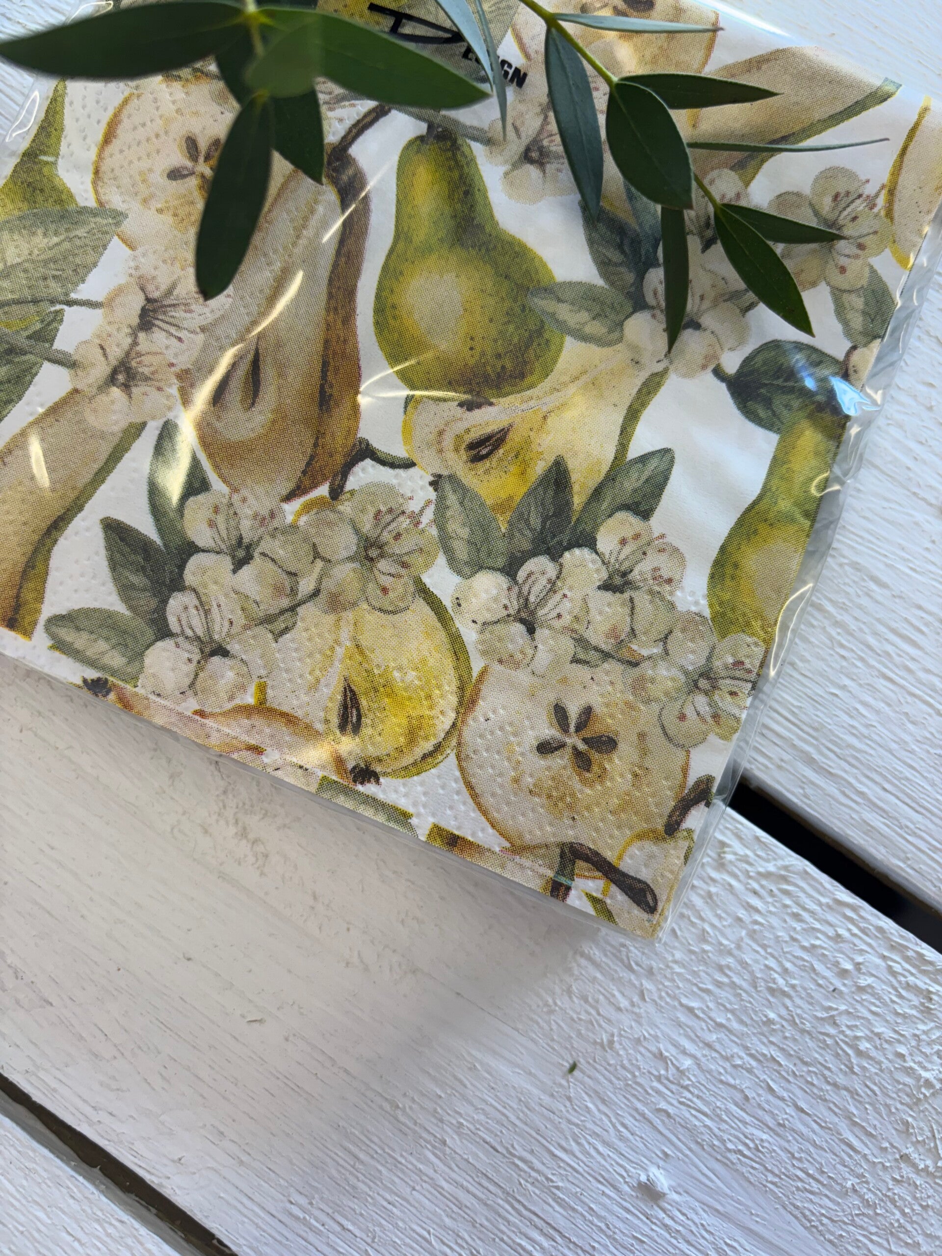 Underbara mindre servetter med päron på, passar perfekt för att piffa till dukningen något extra. Passa på att köpa till våra underbara servettringar också!