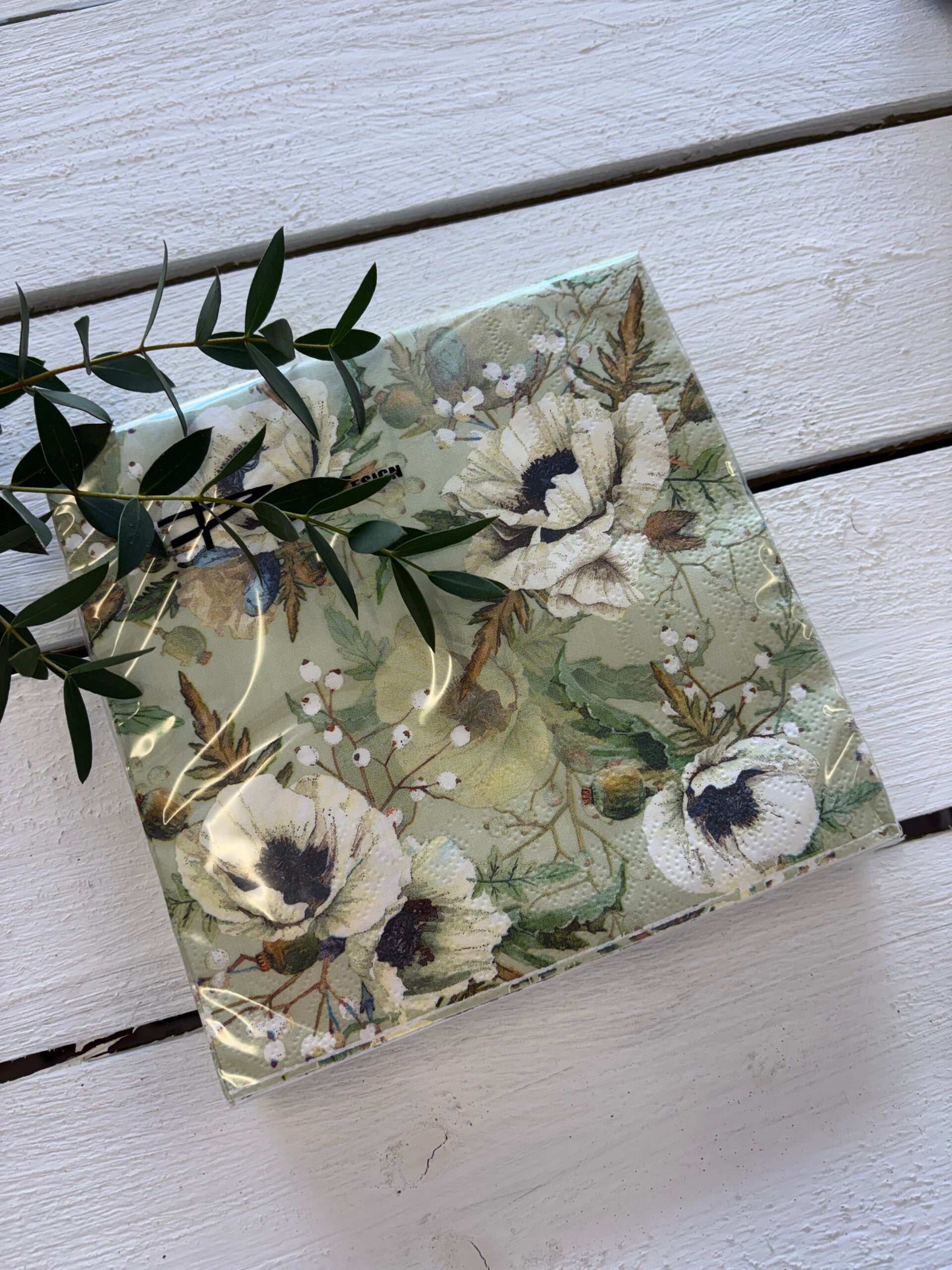 Underbara servetter med grön bakgrund och blommor på, passar perfekt för att piffa till dukningen något extra. Passa på att köpa till våra underbara servettringar också!